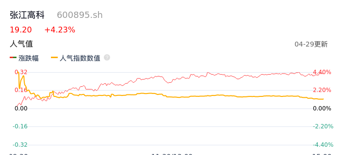 04月29日,张江高科收报19.20,股价涨幅4.23%,成交金额8.74亿元,换手率2.98%。