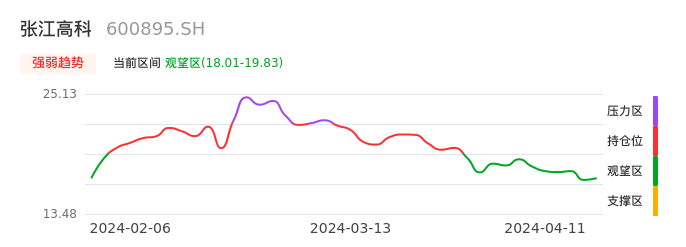 我们来看一下该股的九方特色指标强弱趋势的情况:张江高科自03月26日从持仓区下穿到观望区,股价近期持续走弱。短期已经进入空头行情,且下跌动能仍未衰竭。建议继续谨慎观望。