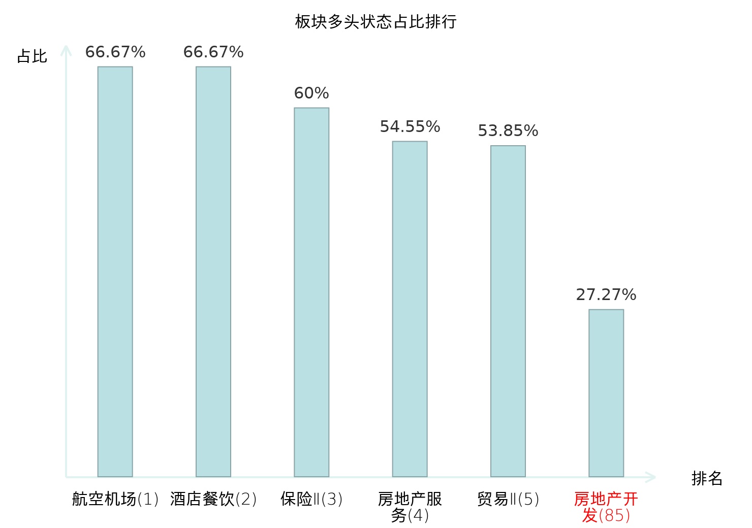全市场所有行业板块中主力多头状态占比排名中,航空机场板块位居第一。专业连锁Ⅱ板块名次提升最快,较昨日上升96位。