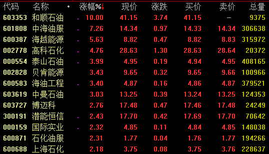 石油板块今日盘中震荡拉升,截至收盘,和顺石油涨停,中海油服涨逾7%,海越能源涨近6%,高科石化涨近5%。