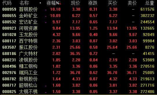 钢铁板块8日盘中发力走强,截至收盘,首钢股份、金岭矿业、宏达矿业等涨停,河钢资源逼近涨停,玉龙股份涨逾4%。
