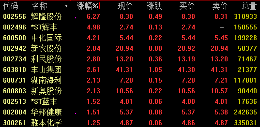 农药板块今日盘中小幅走高,截至收盘,辉隆股份涨逾6%,*ST辉丰涨停,中化国际涨逾4%,新农股份、利民股份、丰山集团等均走强。