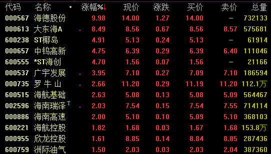 海南板块今日盘中走势活跃,截至收盘,海德股份涨停,大东海A涨逾8%,ST椰岛涨停,广宇发展涨约4%。