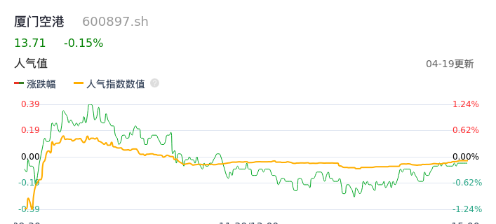 04月19日,厦门空港收报13.71,股价涨幅-0.15%,成交金额6751.63万元,换手率1.18%。