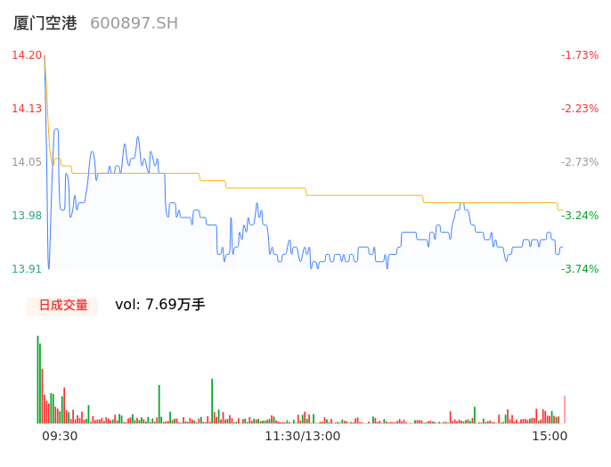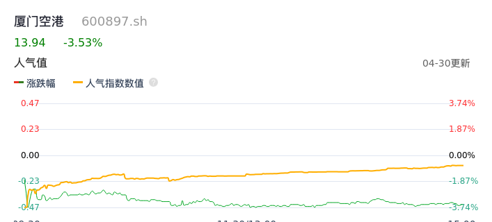 04月30日,厦门空港收报13.94,股价涨幅-3.53%,成交金额1.08亿元,换手率1.85%。