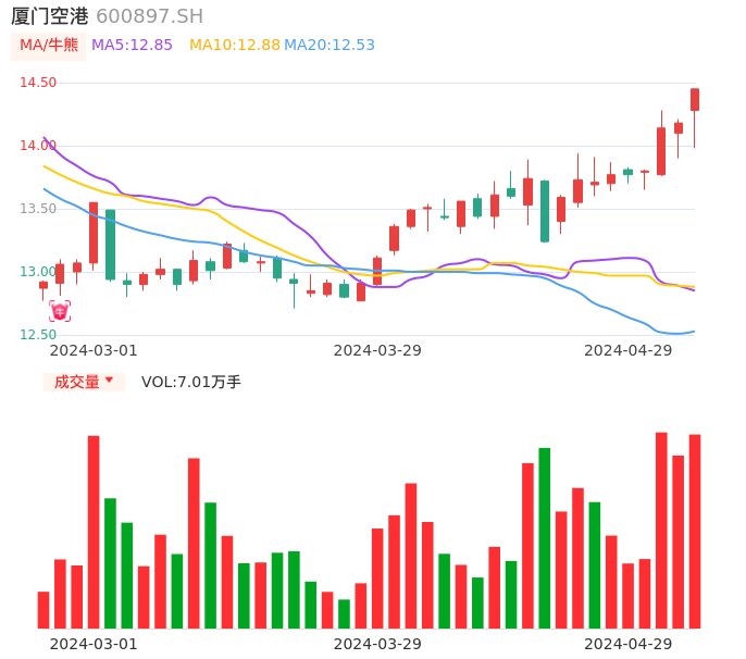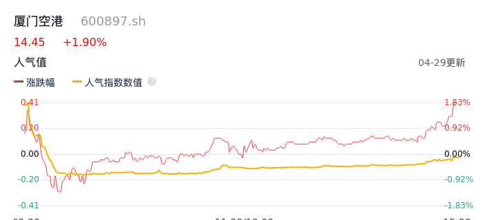 04月29日,厦门空港收报14.45,股价涨幅1.90%,成交金额9963.82万元,换手率1.68%。