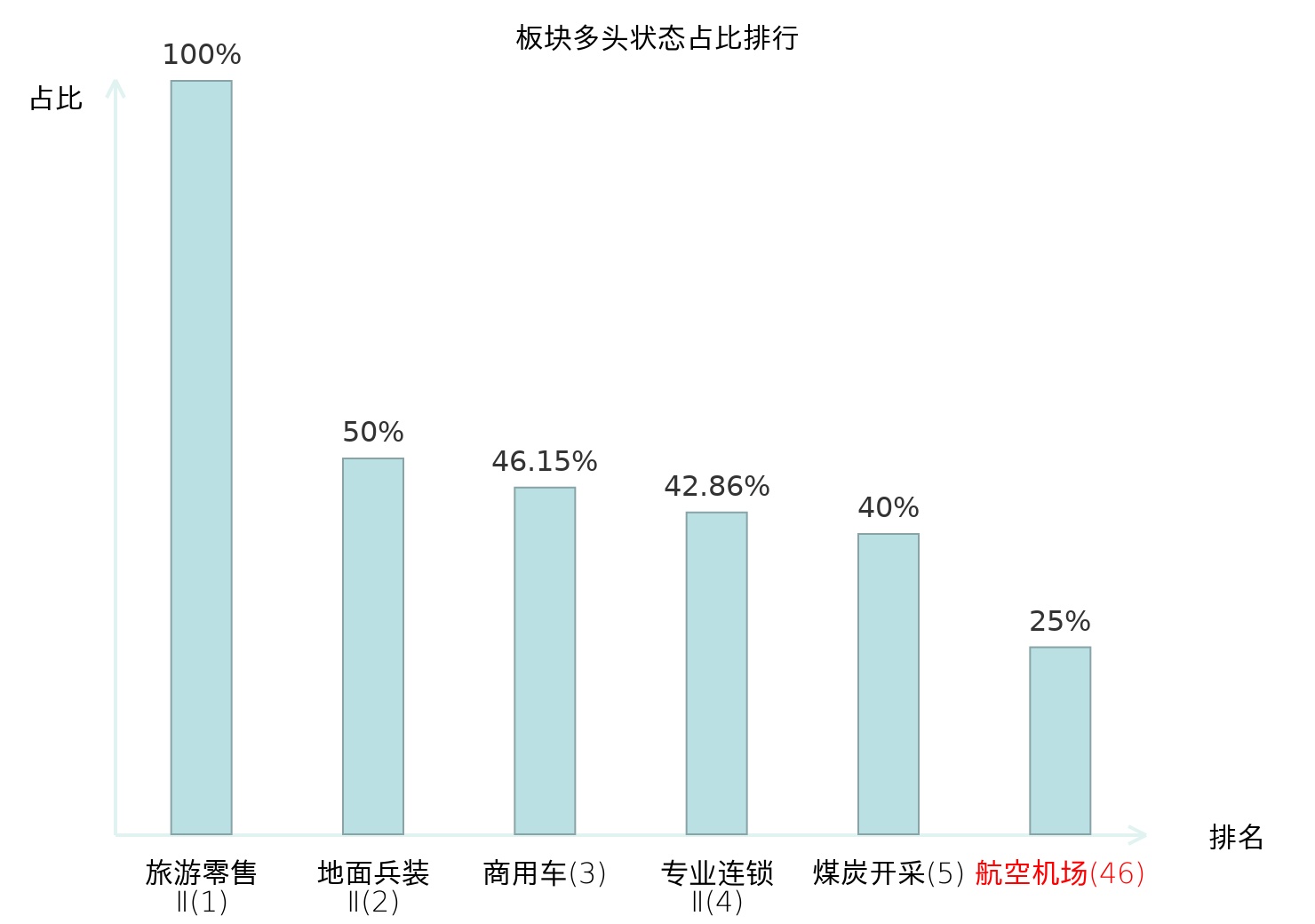 全市场所有行业板块中主力多头状态占比排名中,旅游零售Ⅱ板块位居第一。汽车服务板块名次提升最快,较昨日上升83位。