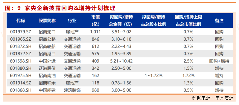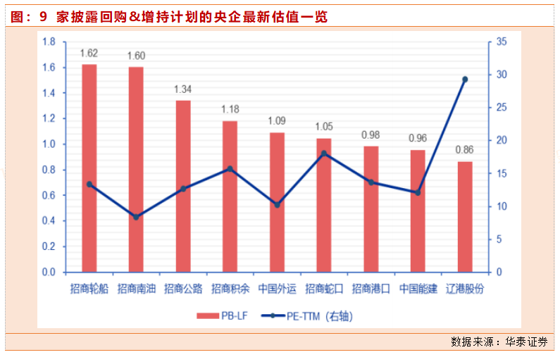上述9家公司均为央企:5家采取回购、3家采取增持,中国外运则采取回购与增持结合的方式,其各自的拟回购/增持金额可见表1。进一步分析这些公司的估值、基本面现状,呈现出三大明显特征: