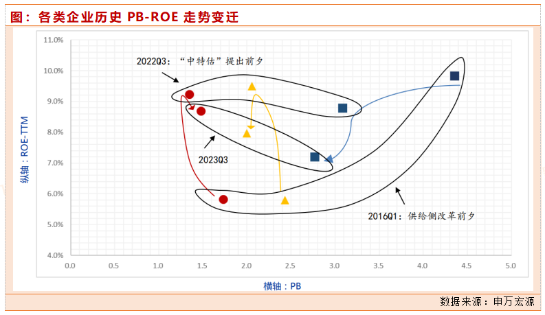 在全部A股上市公司中,央企的市值管理动力最强、潜力最大,A股央企市值大、在主要指数中占比高,理应作为头部企业发挥示范作用。作为A股央企的主管单位,国资委在2024年1月29日更新了央企KPI:2024年在坚持“一利五率”的基础上,增加反映价值创造的针对性指标,并在前期试点的基础上“全面推开上市公司市值管理考核”。参考“日特估”经验,东京证券交易所敦促上市公司努力达到8%的ROE标准,并“强烈建议”PB小于1的上市公司发布估值改善计划。在同样的PBROE估值框架下,A股央企(剔除金融,下同)整体ROE在供给侧改革后,从2016Q1的5.8%修复至2023Q3的8.7%,而PB却从1.73回落至1.48,相较于其他类别企业,事实上已经成为PB最低、ROE最高的一类。