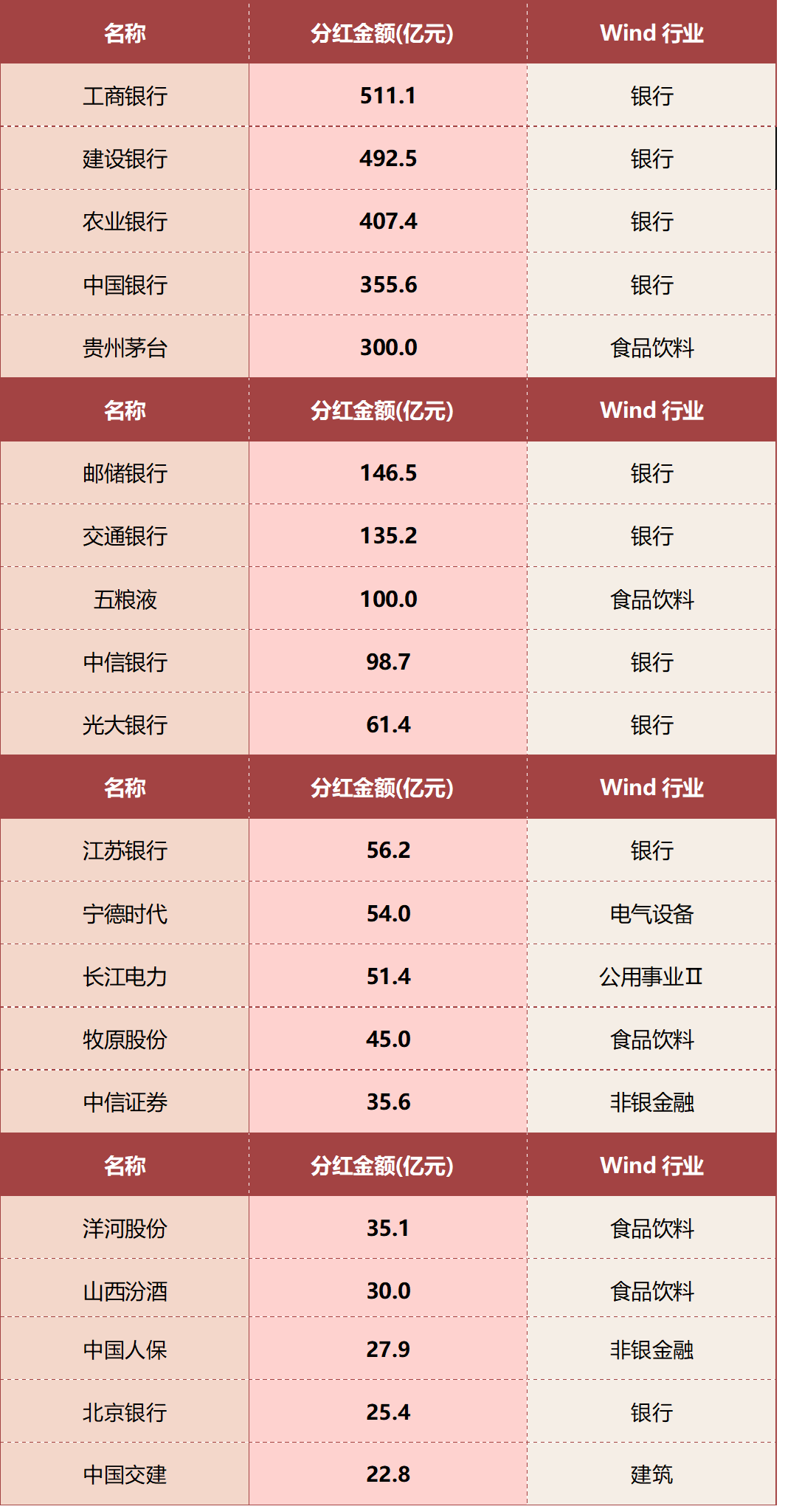 其中,六大行分红2048亿元,茅五汾泸等“五瓶酒”分红近500亿元,长江电力、陕西煤业等“现金奶牛”分红61亿元,宁德时代、赛力斯等民营科技企业分红59亿元,中信证券、中国银河等17家上市券商分红35亿元。