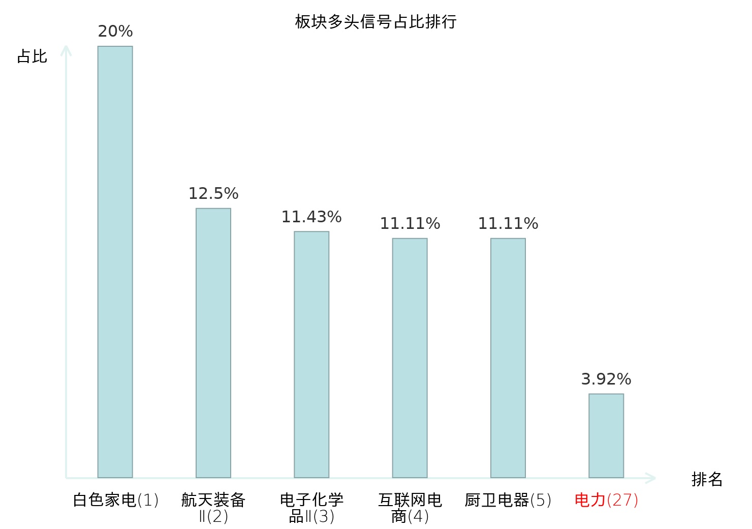 全市场所有行业板块中主力多头信号占比排名中,白色家电板块位居第一。航天装备Ⅱ板块名次提升最快,较昨日上升118位。
