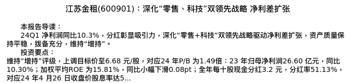 值得注意的是:2024年04月国泰君安的刘欣琦/谢雨晟/李嘉木分析师,首次发布关于江苏金租的研究报告,标题为:江苏金租(600901):深化“零售、科技”双领先战略 净利差扩张。