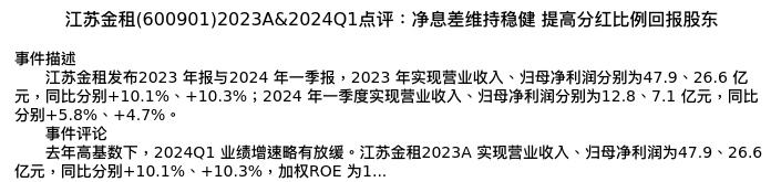 值得注意的是:2024年05月长江证券的吴一凡/赵智勇/戴永飞分析师,首次发布关于江苏金租的研究报告,标题为:江苏金租(600901)2023A&2024Q1点评:净息差维持稳健 提高分红比例回报股东。