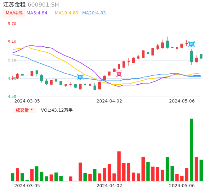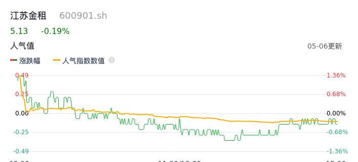 05月06日,江苏金租收报5.13,股价涨幅-0.19%,成交金额2.21亿元,换手率0.99%。