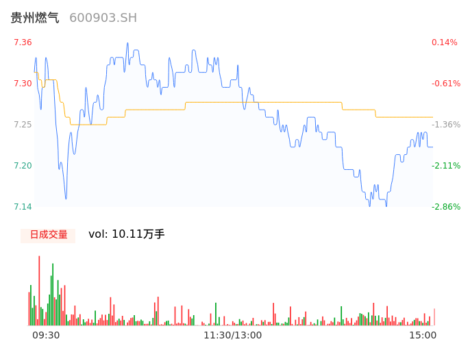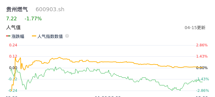 04月15日,贵州燃气收报7.22,股价涨幅-1.77%,成交金额7336.56万元,换手率0.88%。