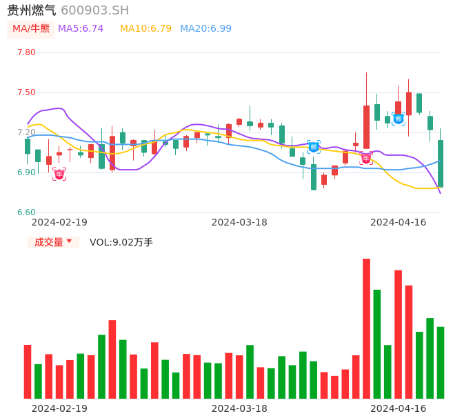 04月16日,贵州燃气收报6.79,股价涨幅-5.96%,成交金额6280.69万元,换手率0.78%。