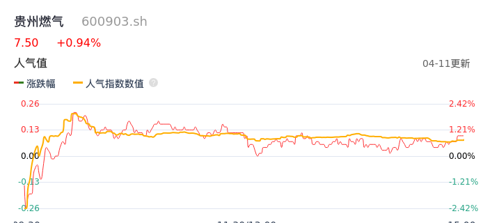 04月11日,贵州燃气收报7.50,股价涨幅0.94%,成交金额1.06亿元,换手率1.24%。
