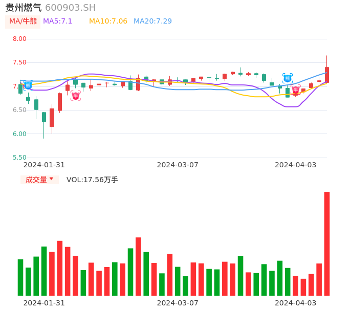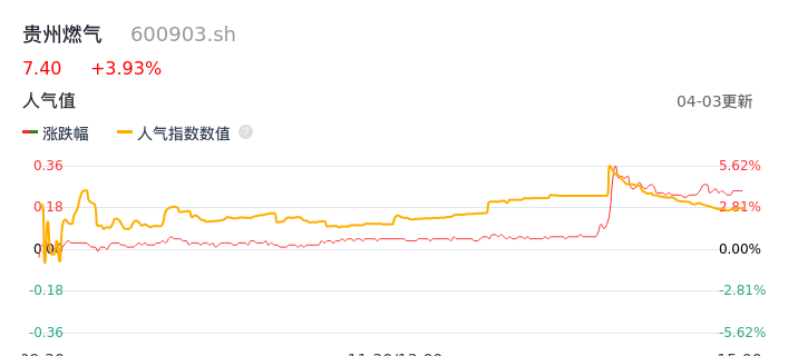 04月03日,贵州燃气收报7.40,股价涨幅3.93%,成交金额1.29亿元,换手率1.53%。