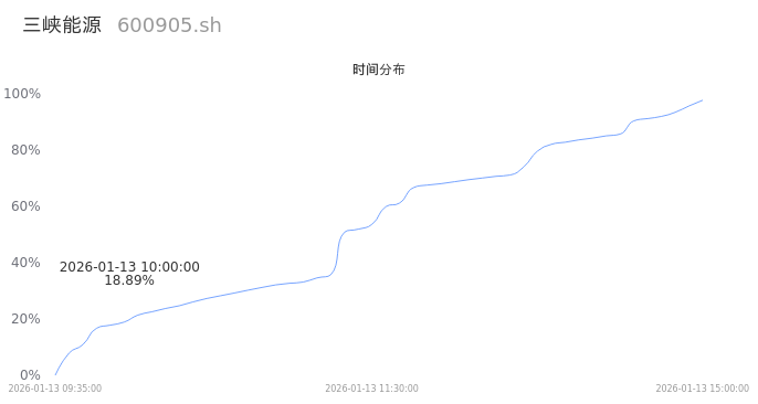 600905三峡能源2026年01月13日成交131.01万手,成交金额5.45亿,相较昨日放量31.08万手,换手率0.46%,成交清淡。