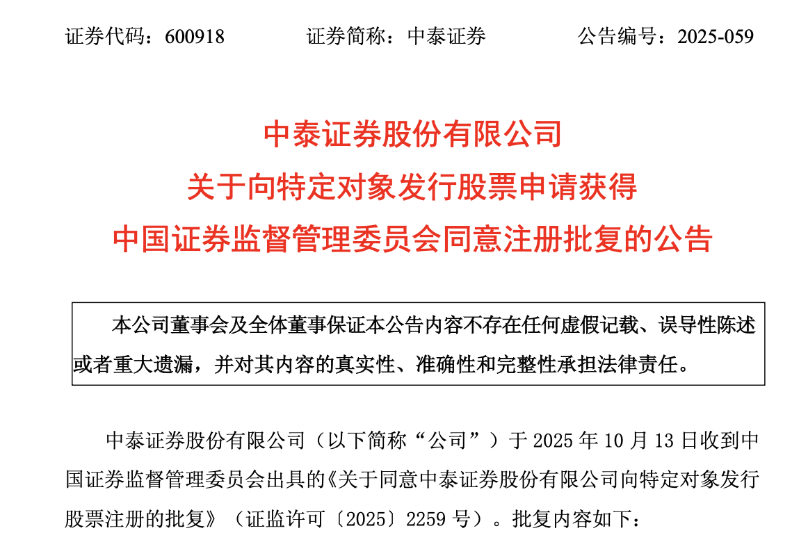 10月13日晚间,中泰证券发布公告,公司不超过60亿元的向特定对象发行股票申请已获得中国证券监督管理委员会同意注册批复,这一历时逾两年的资本补充计划终落地。