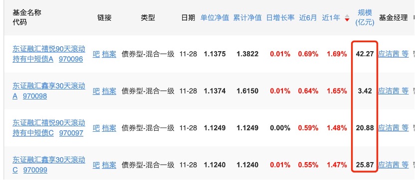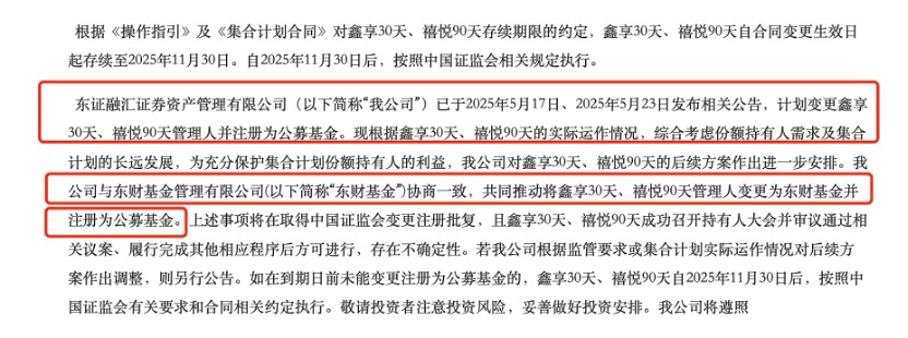 东北证券旗下的资管公司东证融汇资管公告称,旗下鑫享30天、禧悦90天资产管理计划在11月30日交由东财基金管理,东财基金为东方财富100%控股的公募基金公司。