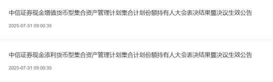 财联社7月31日讯(编辑 王蔚)今日,中信证券资管官网发布旗下两款大集合产品(现金增值货币型集合资产管理计划、现金添利货币型集合资产管理计划)份额持有人大会表决结果暨决议生效公告,表明这两款大集合产品的管理人变更为华夏基金,投资者持有的份额结转为华夏基金的基金份额。