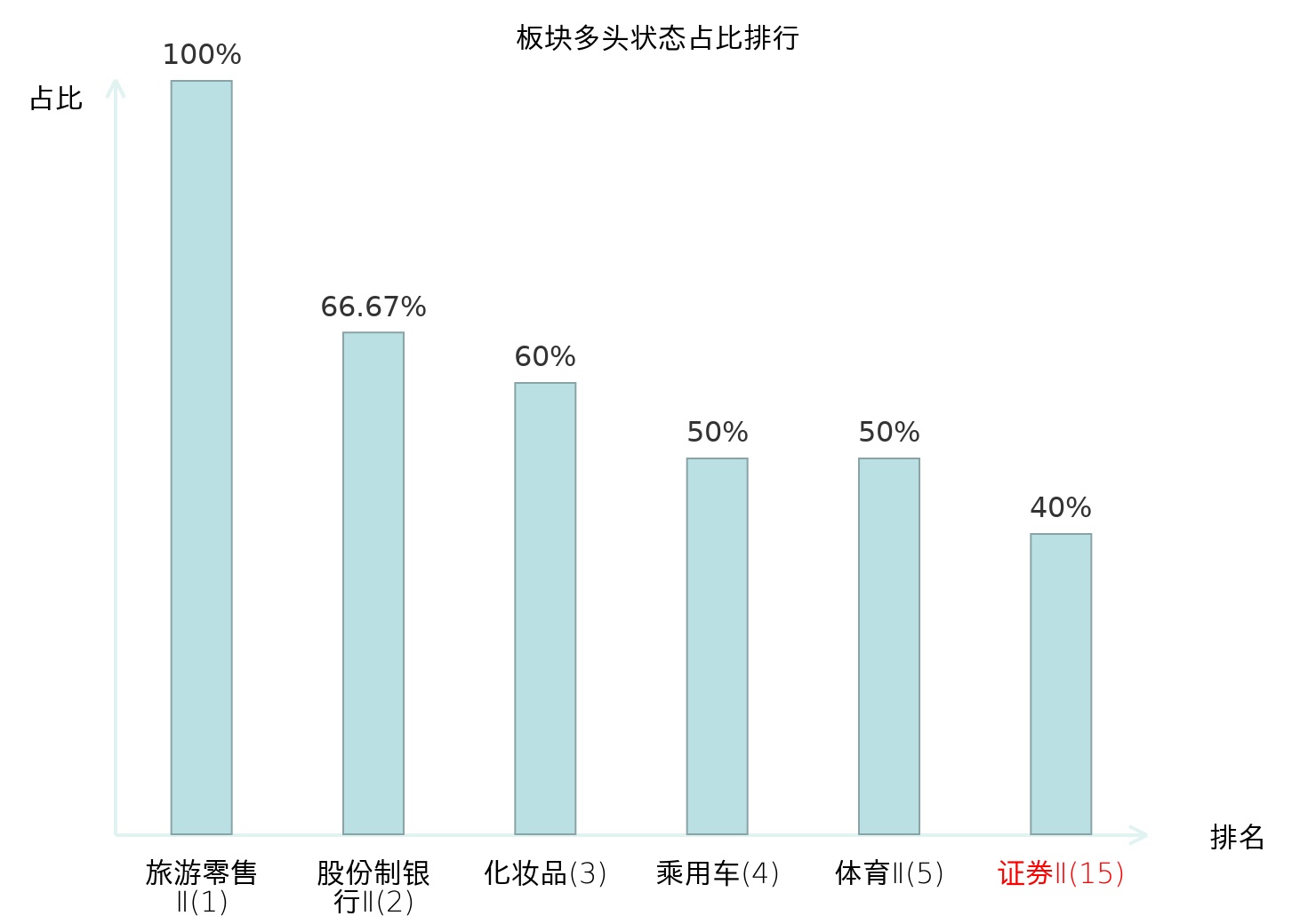 全市场所有行业板块中主力多头状态占比排名中,旅游零售Ⅱ板块位居第一。旅游零售Ⅱ板块名次提升最快,较昨日上升130位。
