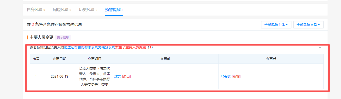 天眼查显示,敖义曾为财达证券海南分公司,海南分公司负责人一职在2024年6月19日发生变更,冯书义接任成为新的负责人。