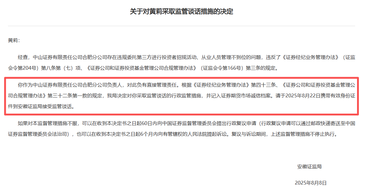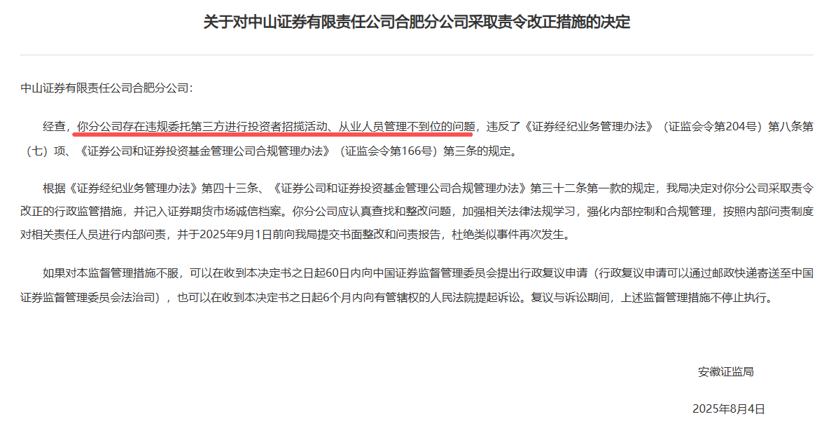 安徽证监局连续发布两张罚单,中山证券合肥分公司及其负责人黄莉分别被采取责令改正和监管谈话措施,该分公司存在违规委托第三方进行投资者招揽活动、从业人员管理不到位的问题。