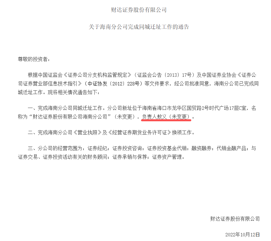 此外,在2022年10月财达证券的一份关于海南分公司同城迁址的通告中,明确指出迁址后分公司负责人仍为敖义,且名称未变更。这表明至少在2022年10月,他仍是该分公司的负责人。