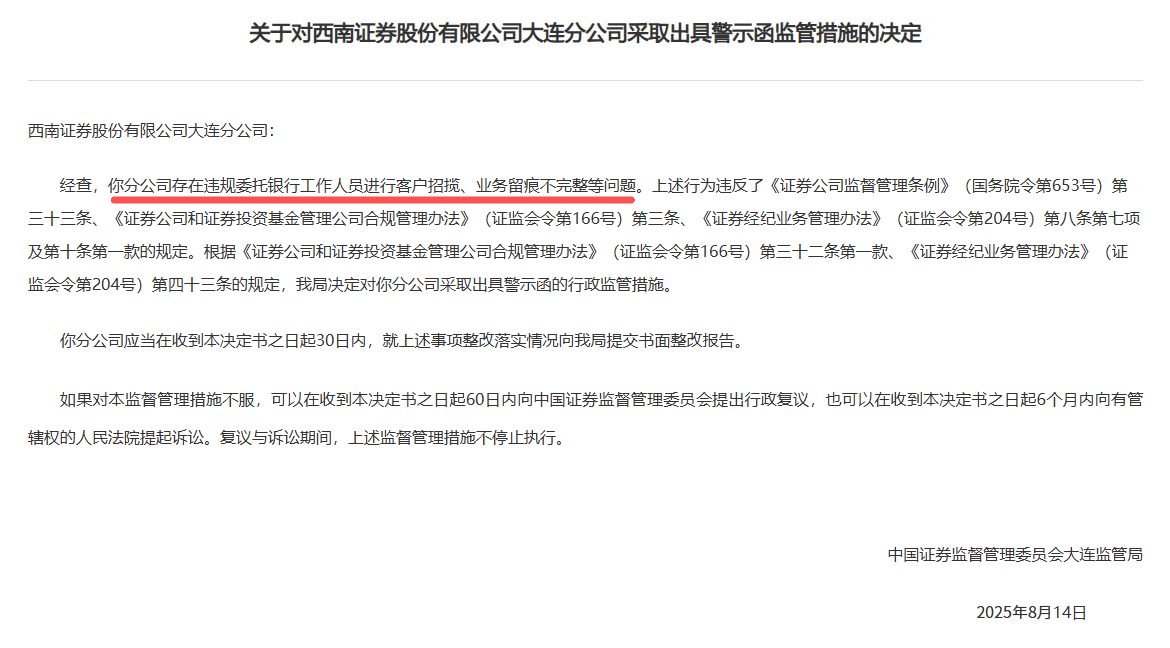 大连证监局罚单显示,西南证券大连分公司被采取出具警示函监管措施,分公司存在违规委托银行工作人员进行客户招揽、业务留痕不完整等问题。