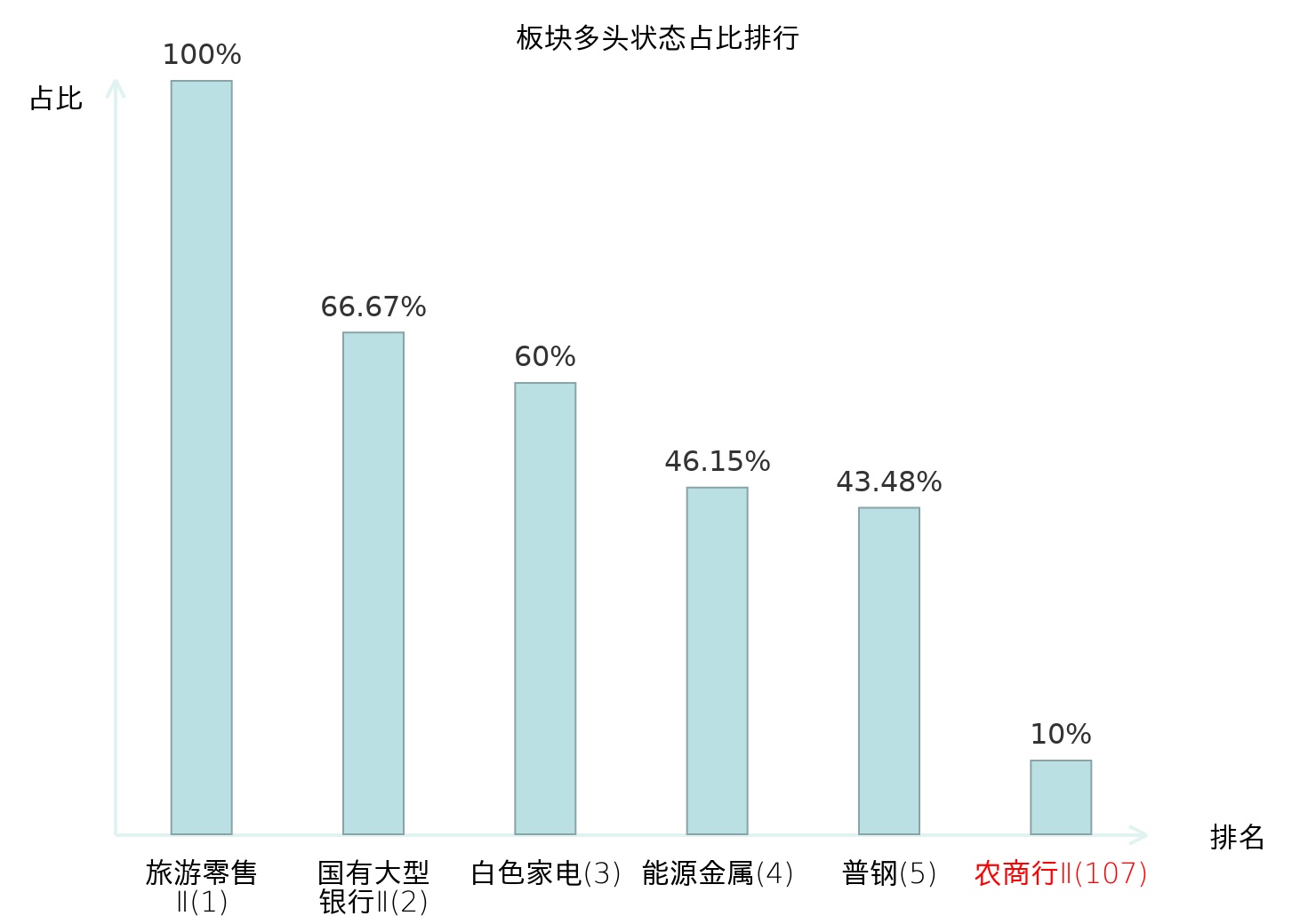 全市场所有行业板块中主力多头状态占比排名中,旅游零售Ⅱ板块位居第一。光学光电子板块名次提升最快,较昨日上升59位。