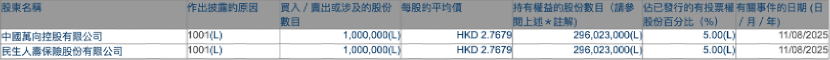 港交所最新权益披露资料显示,民生人寿8月11日增持100万股浙商银行H股股份后,于当日达到该行H股股本的5%,根据港股市场规则,触发举牌。