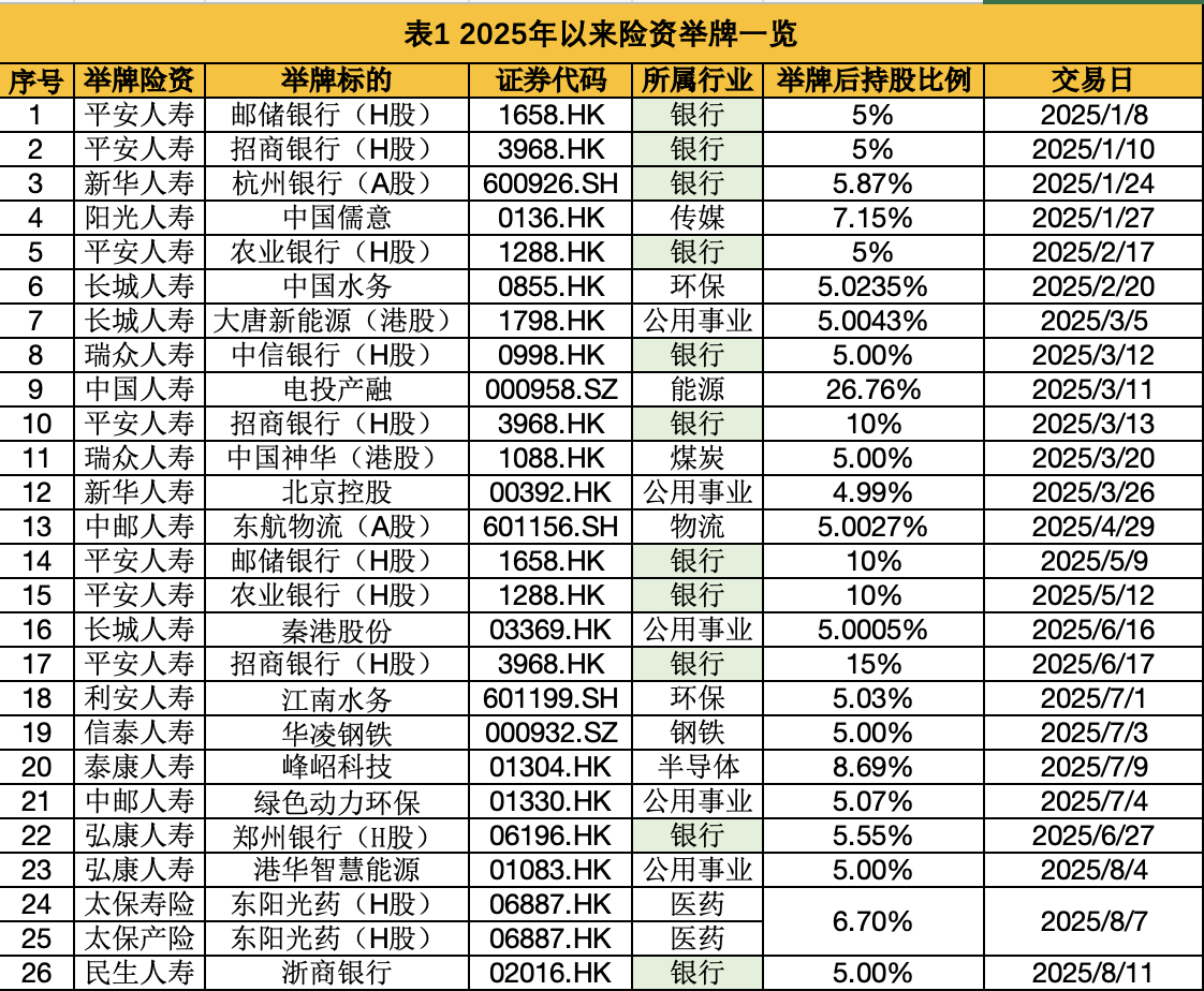 年内险资26次举牌11次涉及银行股,中资银行H股占比9成