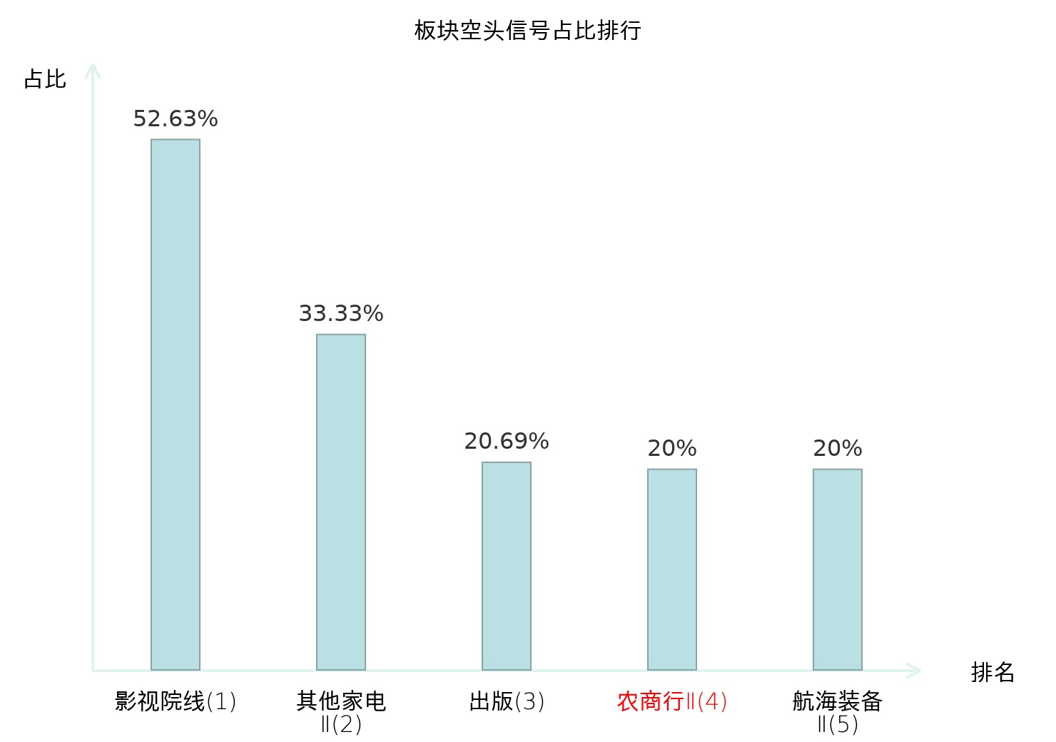 全市场所有行业板块中主力空头信号占比排名中,影视院线板块位居第一。出版板块名次提升最快,较昨日上升115位。