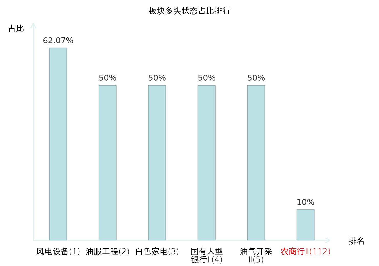 全市场所有行业板块中主力多头状态占比排名中,风电设备板块位居第一。动物保健Ⅱ板块名次提升最快,较昨日上升64位。
