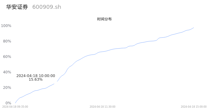 600909华安证券2024年04月18日成交41.32万手,成交金额1.91亿元,相较昨日放量9.22万手,换手率0.88%,成交清淡。