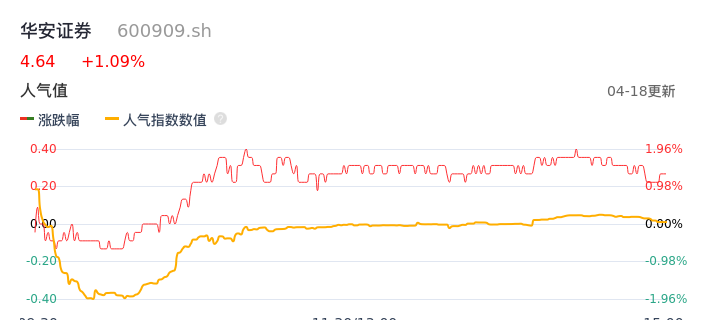 04月18日,华安证券收报4.64,股价涨幅1.09%,成交金额1.91亿元,换手率0.88%。