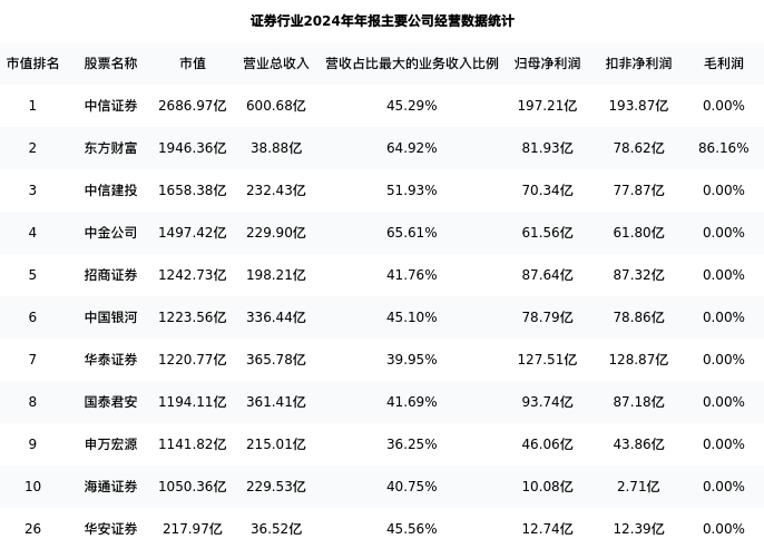 华安证券最新报告期数据为年报,下表汇总了证券行业内市值靠前的公司年报主要经营数据