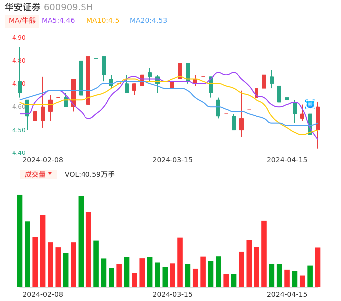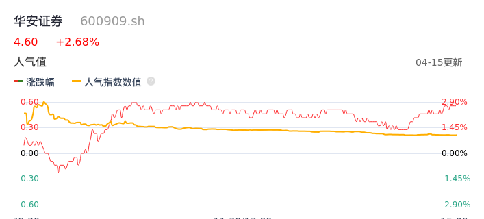 04月15日,华安证券收报4.60,股价涨幅2.68%,成交金额1.85亿元,换手率0.86%。