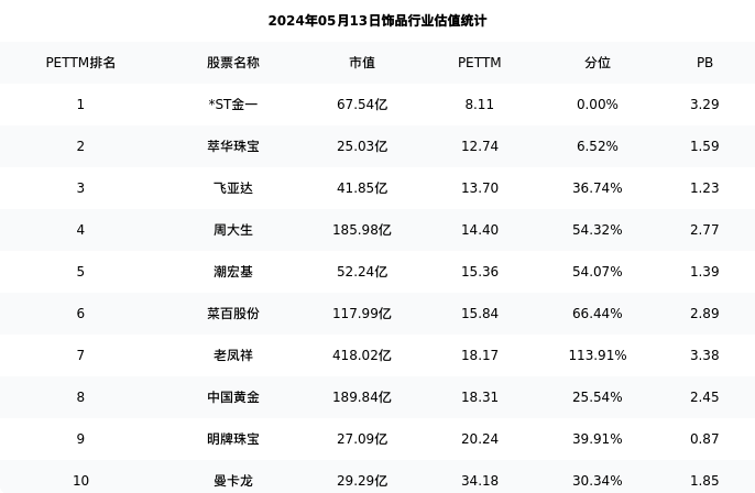 中国黄金最新报告期数据为一季度,下表汇总了饰品行业内市值靠前的公司一季度主要经营数据