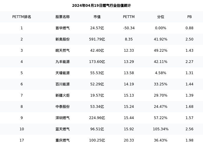 从估值角度看:重庆燃气最新市盈率PETTM为20.33,在行业内排名16/29,处于36.43分位。