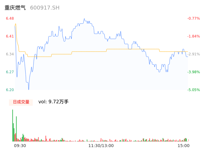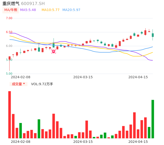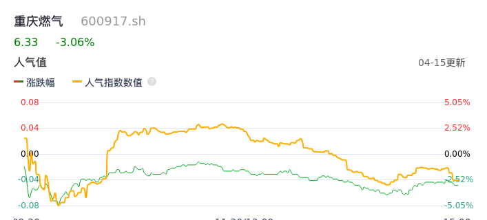 04月15日,重庆燃气收报6.33,股价涨幅-3.06%,成交金额6169.60万元,换手率0.62%。