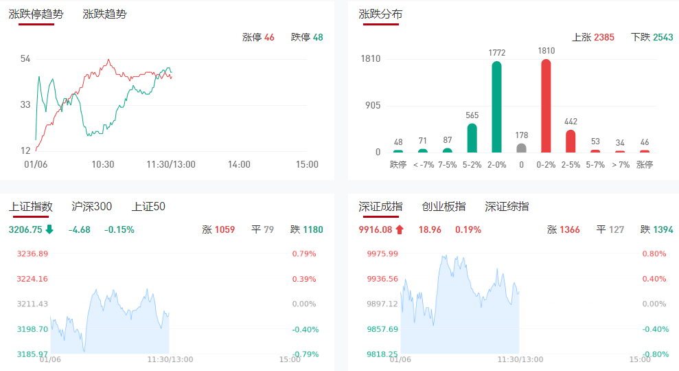 市场早盘震荡反弹,三大指数涨跌不一,沪指一度跌破3200点。沪深两市半日成交额6927亿,较上个交易日缩量518亿。盘面上热点较为杂乱,整体上反弹力度较弱,逾50股跌停或跌超9%。从板块来看,医药股集体走强,流感方向领涨,鲁抗医药等涨停。数据中心电源概念股表现活跃,中恒电气等涨停。有色、稀土等周期股一度反弹,广晟有色涨停。下跌方面,大消费股继续调整,东百集团等多股跌停;AI眼镜概念股集体大跌,华灿光电等多股跌超10%。