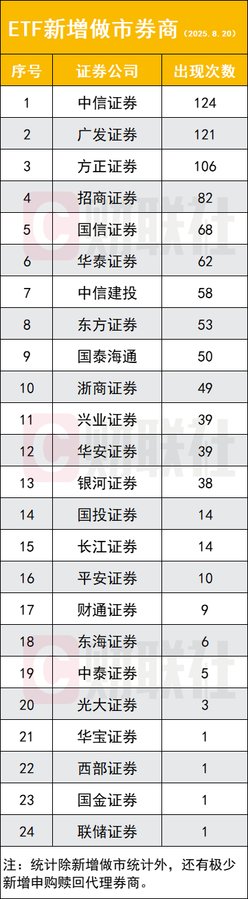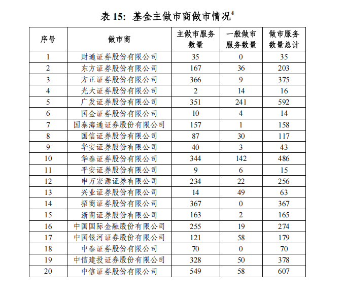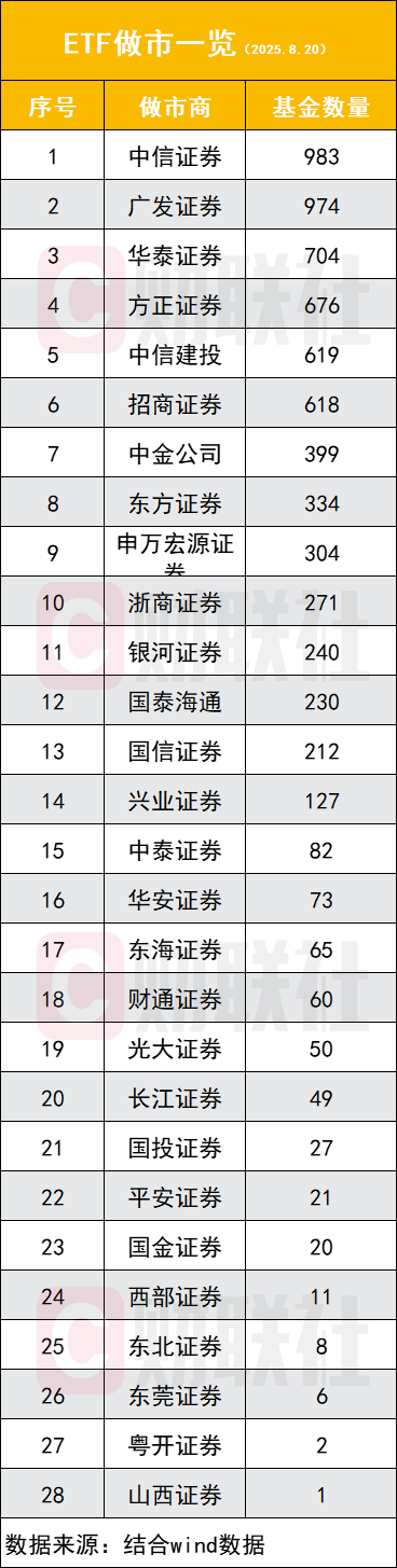 目前,ETF做市数量排名较多的券商依次是中信证券(983只)、广发证券(974只)、华泰证券(704只)、方正证券(676只)、中信建投(619只)、招商证券(618只)、中金公司(399只)、东方证券(334只)、申万宏源证券(304只)。