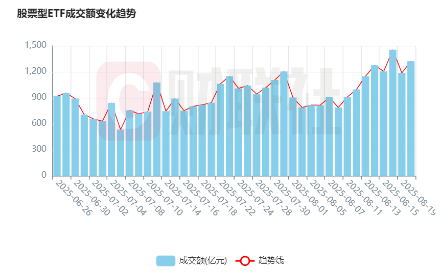 投资者对股票型ETF的关注度和参与度持续提升,自7月以来,股票型ETF成交额整体呈现波动上升态势,尤其在8月中旬表现出强劲增长。截至8月20日,股票型ETF连续6个交易日成交额超过千亿,8月18日创下1454.54亿元的最高成交额,8月20日成交额为1322.38亿元。