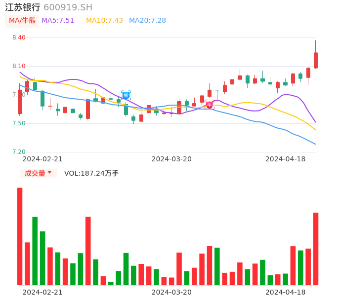 04月18日,江苏银行收报8.24,股价涨幅1.98%,成交金额15.41亿元,换手率1.02%。