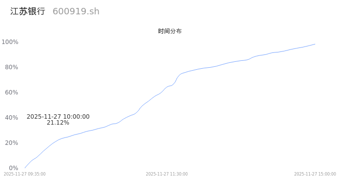 600919江苏银行2025年11月27日成交109.78万手,成交金额11.79亿,相较昨日缩量5.78万手,换手率0.60%,成交清淡。
