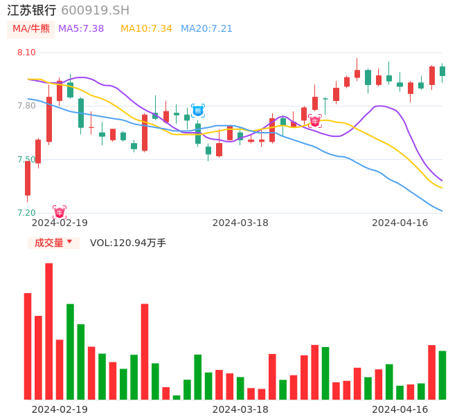 04月16日,江苏银行收报7.97,股价涨幅-0.62%,成交金额9.66亿元,换手率0.66%。