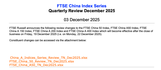 123日,富时罗素宣布对富时中国50指数、富时中国A50指数、富时中国A150指数、富时中国A200指数、富时中国A400指数的审核变更。该变更将于20251219日星期五收盘后生效。